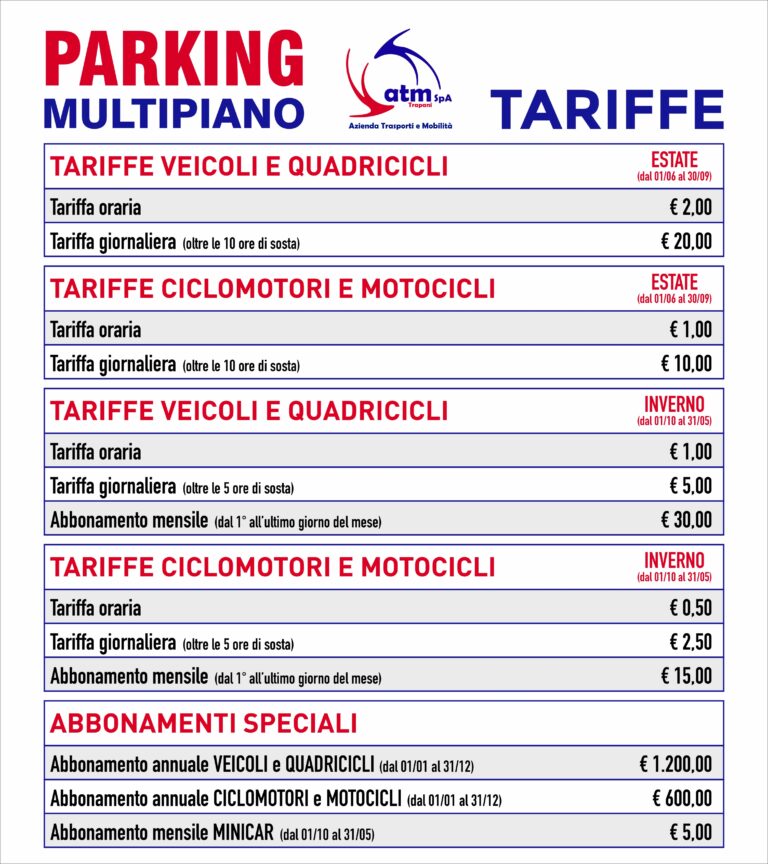 Con deliberazione n.70 del 24/06/2019 il Consiglio Comunale di Trapani ha stabilito l’affidamento in concessione “in house providing” ad ATM Spa Trapani Spa del servizio di gestione del Parcheggio Multipiano fino al prossimo 31/12/2028.